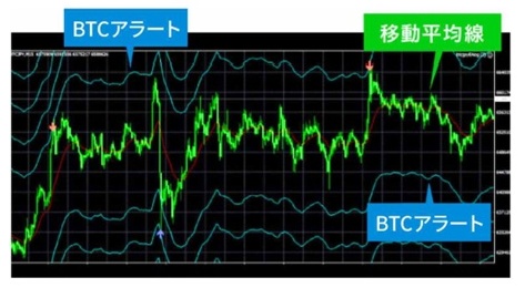 緑色のチャートは、ビットコインの移動平均線であり、上下にある青いラインはBTCアラートと呼ばれます。